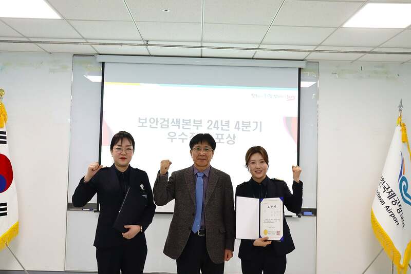 지난 2월 10일, 인천국제공항보안(주) <2월 확대간부회의>에서 해당분야의 우수한 업적을 이룬 직원들을 대상으로 총 3건의 포상이 진행되었습니다. ![]() 첫번째로, '2025 보안검색 우수직원 특별포상' 이 진행되었습니다. 지난 1월, T1출국장에서의 마약적발 건으로 T1검색그룹의 김○석, 오○훈, 허○구 직원이 모범상을 수상하였습니다. ![]() 두번째로, '2024년 4분기 보안검색 우수직원 포상'이 진행되었습니다. 업무평가 우수 및 친절서비스 우수 부분에서 우수한 역량을 보여준 최○주, 길○륜, 양○선, 이○혜 직원이 우등상을 수상하였습니다. ![]() 마지막으로, '보안경비본부 우수 업무제안서 포상' 이 진행되었습니다. 보안분야에서 획기적인 업무제안서를 작성해 주신 박○진 대원이 우등상을 수상하였습니다. 이번 포상식을 통해 전 직원들에게 모범이 되어 동기부여를 제공해주신 임직원 여러분께 다시 한번 감사드리며, 앞으로도 인천국제공항보안(주)는 언제나 세계적인 수준의 무결점 항공 보안을 지켜 나갈 것을 약속드립니다. 감사합니다. |